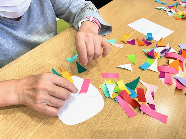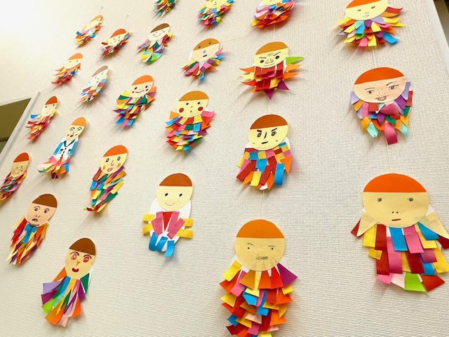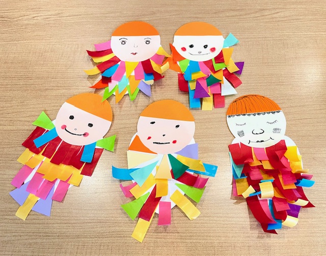様々な色の折り紙や紙テープをふんだんに使って、みのむし君のステキなドレスを作っていただきました👗💖
